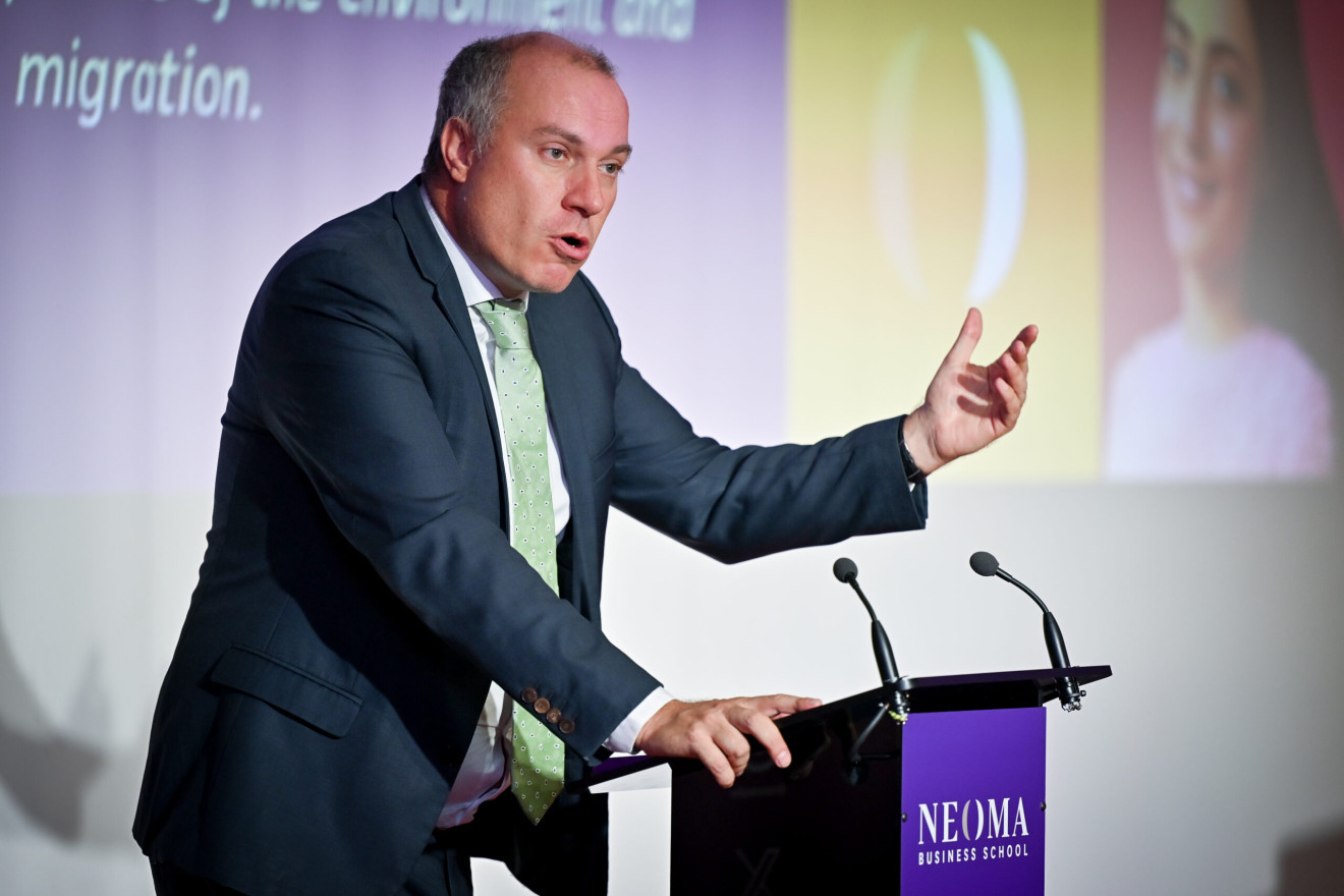 11:30 a.m. Michel-Edouard Leclerc, president of NEOMA and president of the E. Leclerc strategic committee took the stage.